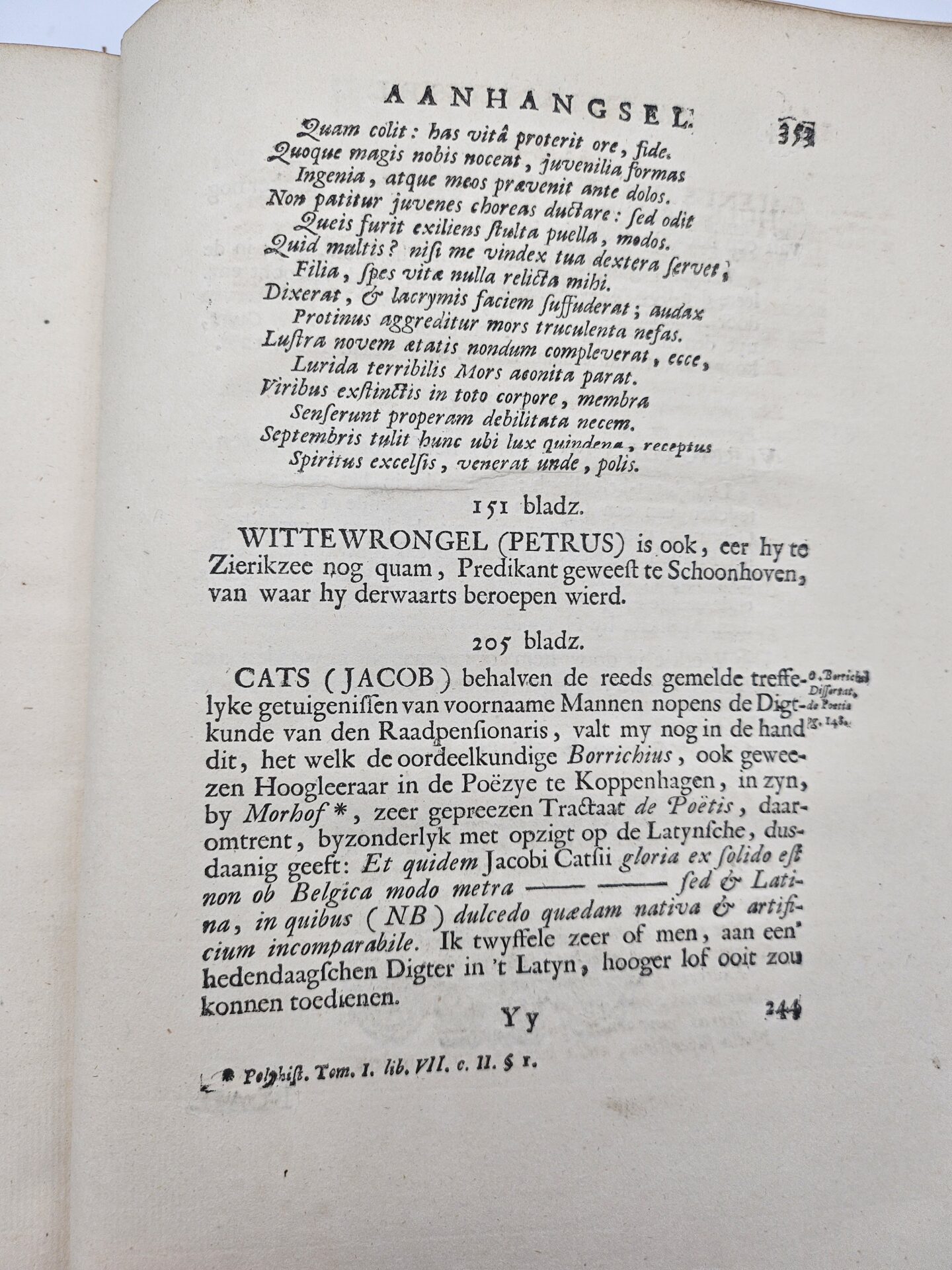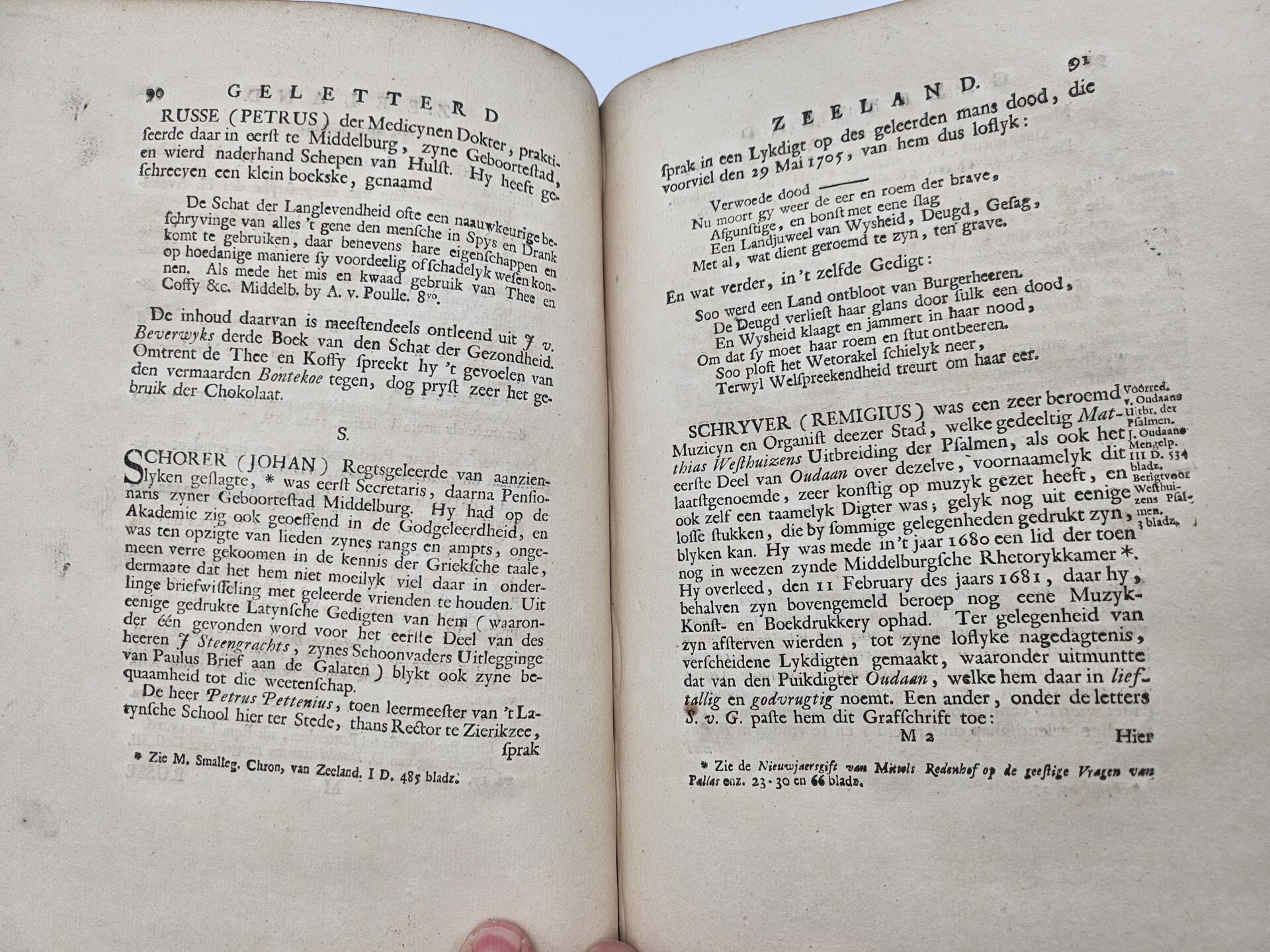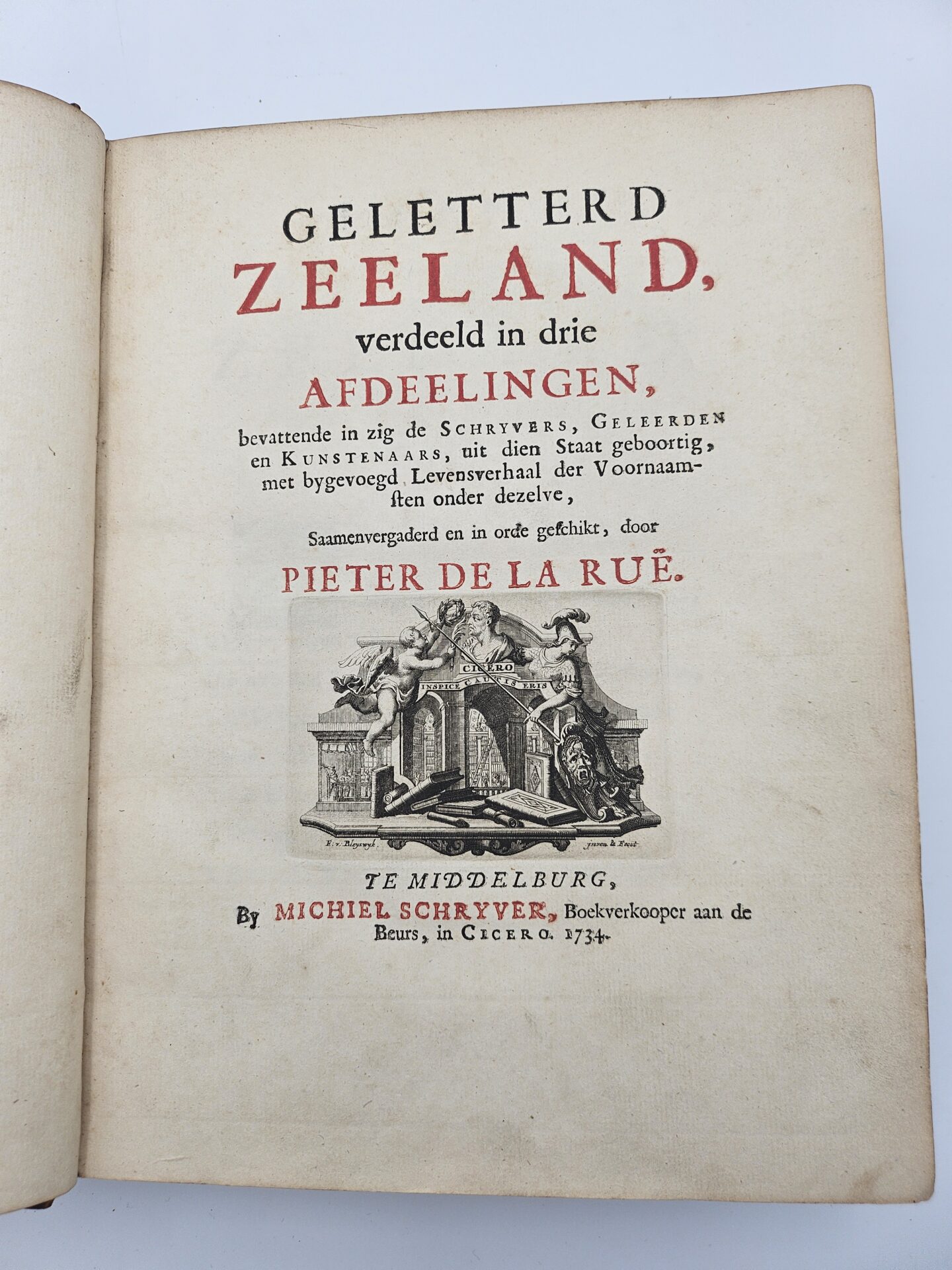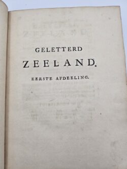 Pieter de la Rue, 1695-1770, was een begaafd dichter, koopman en jurist. Hij woonde in Middelburg en beschrijft in dit werk in drie delen aan de hand van het alfabet, de belangrijkste schrijvers, geleerden en kunstenaars uit Zeelands Gouden Eeuw. Beide knepen van de band zijn ingescheurd.