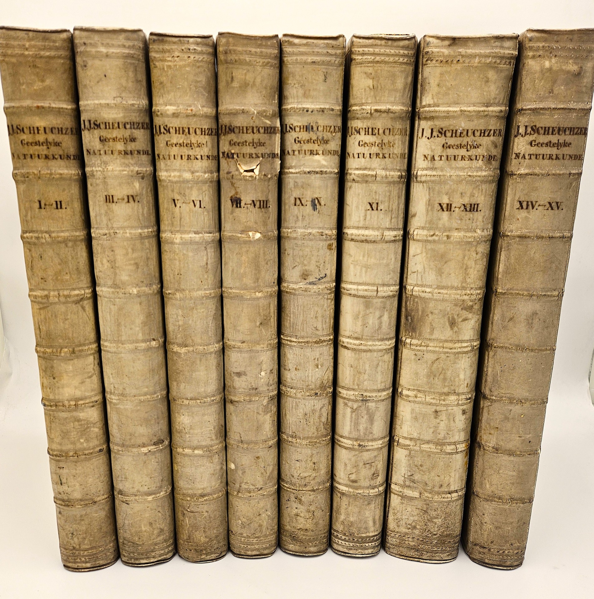J.J. Scheuchzer, 1672-1733, was een Zwitserse geleerde, bekend door zijn in 1727 in het Duits en het Latijn uitgegeven werk: ‘Physica Sacra’ of ‘Heilige Natuurkunde’, in hetwelk hij al het natuurkundige, in de Bijbel voorkomende, probeerde te verklaren en uit te leggen op een Bijbelse wijze. In Nederland kwam dit werk voor het eerst in 1735 uit. 760 grote prenten op 758 platen waarvan 5 dubbel-pagina. Met onderschriften bij elke prent in het Latijn en Duits. (Perkament van de ruggen wat vervuild, gedeelte van de rug van deel 7/8 beschadigd, het portret van de graveur ontbreekt, boekblok en prenten in zeer goede staat, helder en fris).