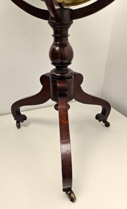 The globe is mounted in a calibrated brass meridian with an hour ring on the north pole and a wooden horizon ring with the houses of the zodiac, the months of the year, azimuth amplitude, and so on. The horizon ring is raised on four quadrant arcs on a turned baluster column supported on mahogany tripod legs on wheels. The compass is missing.