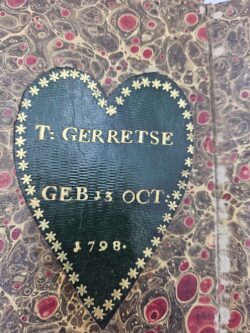 Met een hartvormige, groen leren opdruk op het eerste schutblad: T. GERRETSE GEB 13 OCT. 1798.