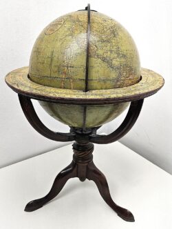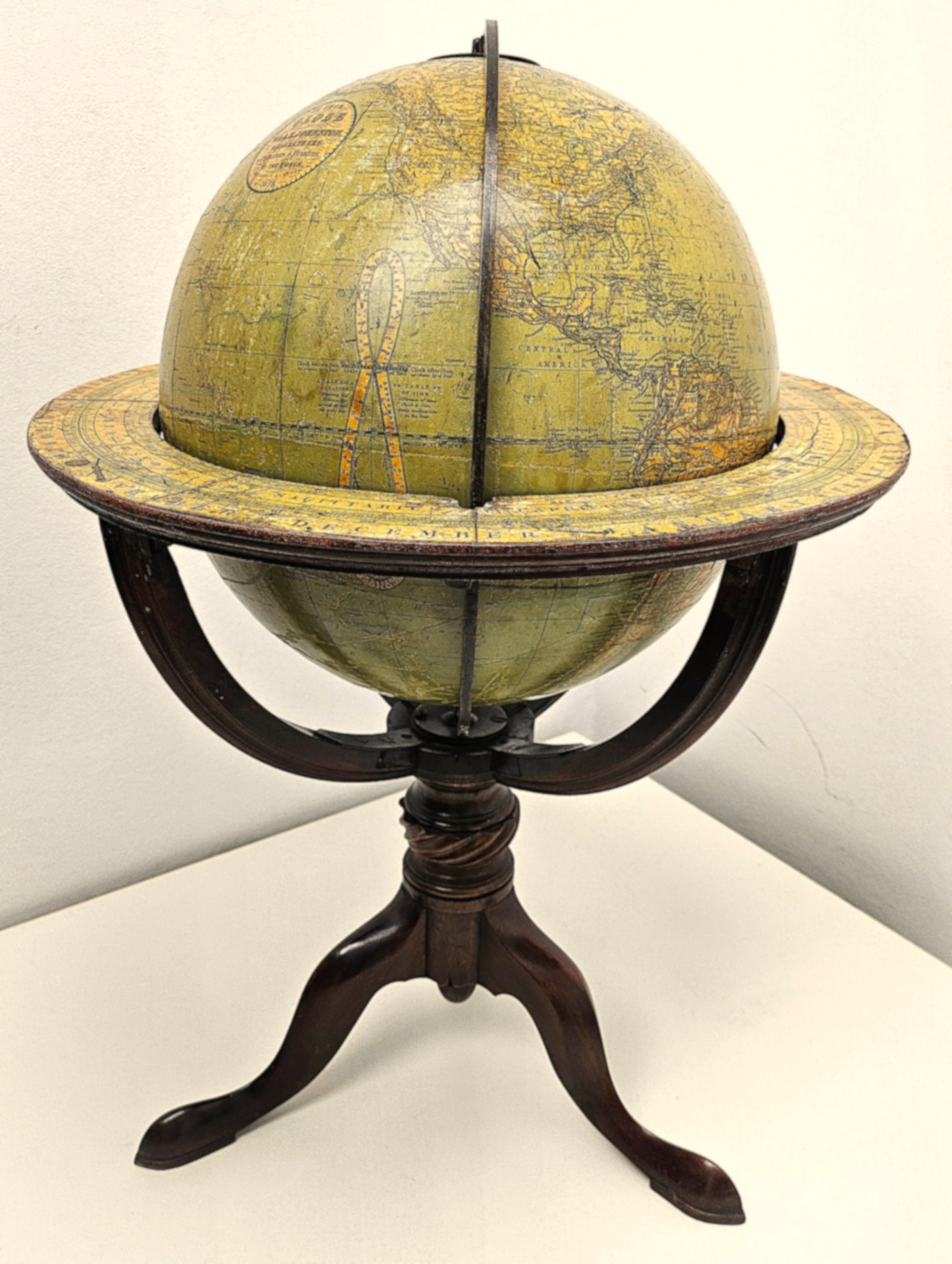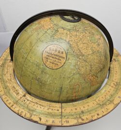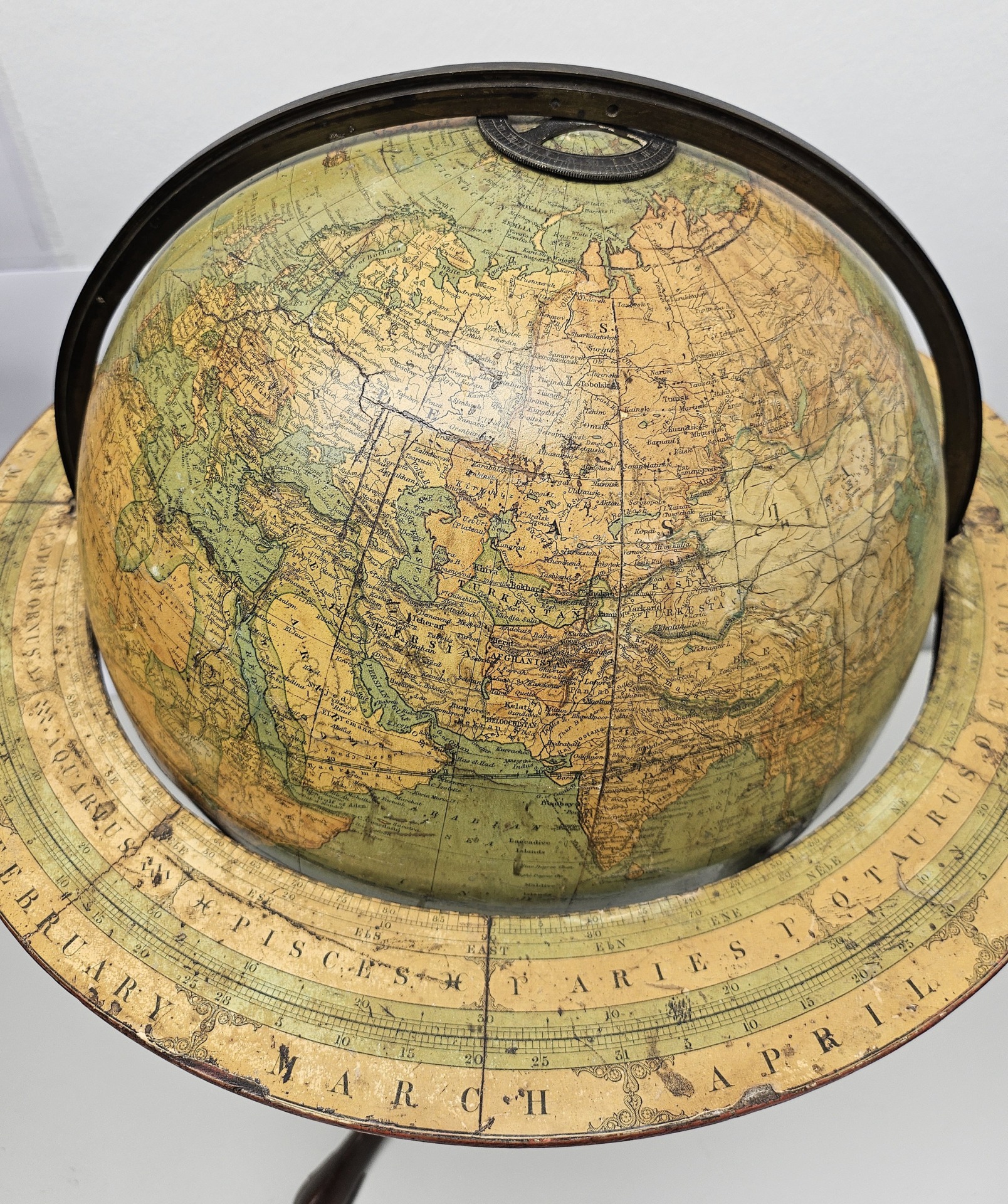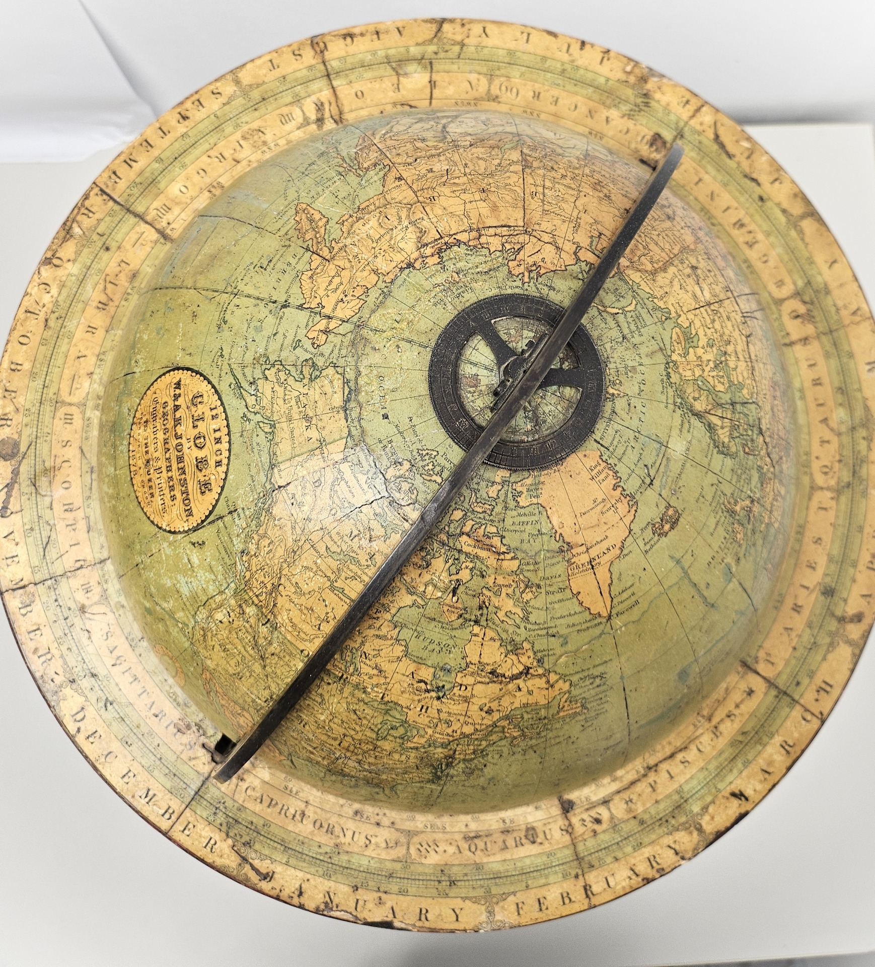 The globe is mounted in a calibrated brass meridian with an hour ring on the north pole and a wooden horizon ring with the houses of the zodiac, the months of the year,