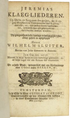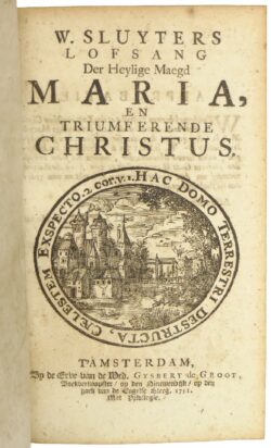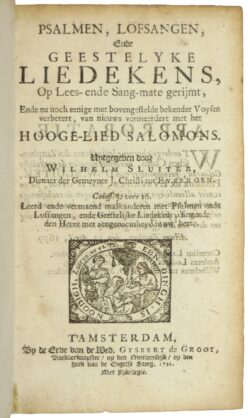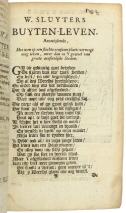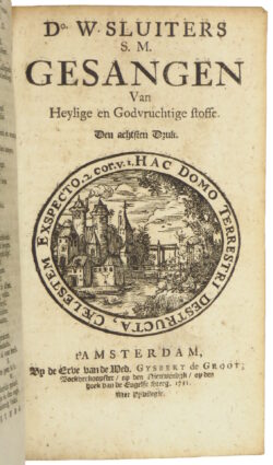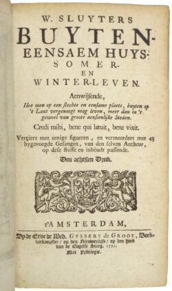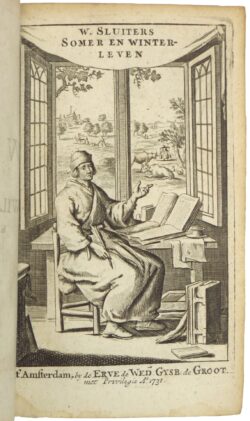 Al de Werken: W. Sluyters Buyten- Eensaem Huys- Somer- en Winter-Leven. Aenwijsende, Hoe men op een slechte en eensame plaets, buyten op ‘t Lant vergenoegt mag leven, meer dan in ‘t gewoel van groote aensienlijke Steden. Verçiert met eenige figueren, en vermeerdert met 43 bygevoegde Gesangen, van den selven Autheur, op dese stoffe en inhoudt passende. De achtsten Druk. WAARBIJ: Eybergsche Sang-Lust,mitsgaders Vreugd-en Liefde-Sangen. WAARBIJ: Gezangen van Heilige en Godvruchtige stoffe, den achtsten druk. WAARBIJ: Psalmen, Lofsangen ende Geestelyke Liedekens….vermeerdert met het Hooge-Lied Salomons / Jeremia’s Klaeg-Liederen / Lof der Heilige Maegd Maria, en Triumpheerende Christus. WAARBIJ: W. Sluyters Vreugd- en Liefde-sangen. WAARBIJ: Christelyke Doods-Betrachting, den achtsten druk 1731 Gijsb.de Groot, Bestaende in verscheide Sterf-Gesangen,en Doods-Echtscheidinge en W.Sluiters Lyk-Reden.