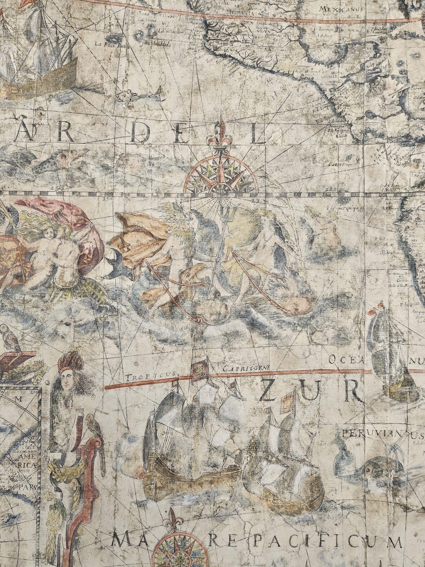 The map has been beautifully decorated with cartouches and small engravings. The cartouche in the lower right tells how the New World was discovered, and is flanked by the figures of Christopher Columbus and Amerigo Vespucci. Below are four roundels containing the portraits of the four circumnavigators: Ferdinand Magellan, Sir Francis Drake, Sir Thomas Cavendish, and Olivier Van Noort. The Atlantic features a beautiful depiction of King Philip III of Spain riding a sea chariot, supposedly on a figurative visit to his New World possessions, and in the Pacific Poseidon with his wife Amphitrite and son Triton can be found, amidst battle ships and sea monsters. Elephants, rhinoceroses, camels, and ostriches roam the continent. Some copies of the present map include a decorative border with illustrations of native people, and sometimes also a textual border with descriptions, which are not present here. It appears that these borders were engraved on separate copper plates and were not always included.