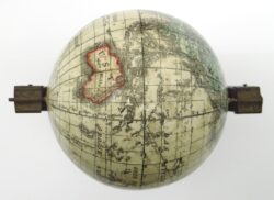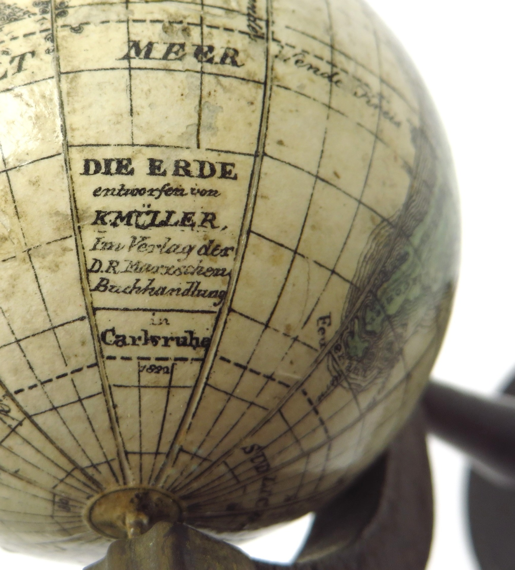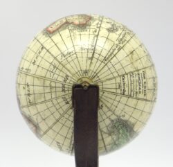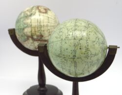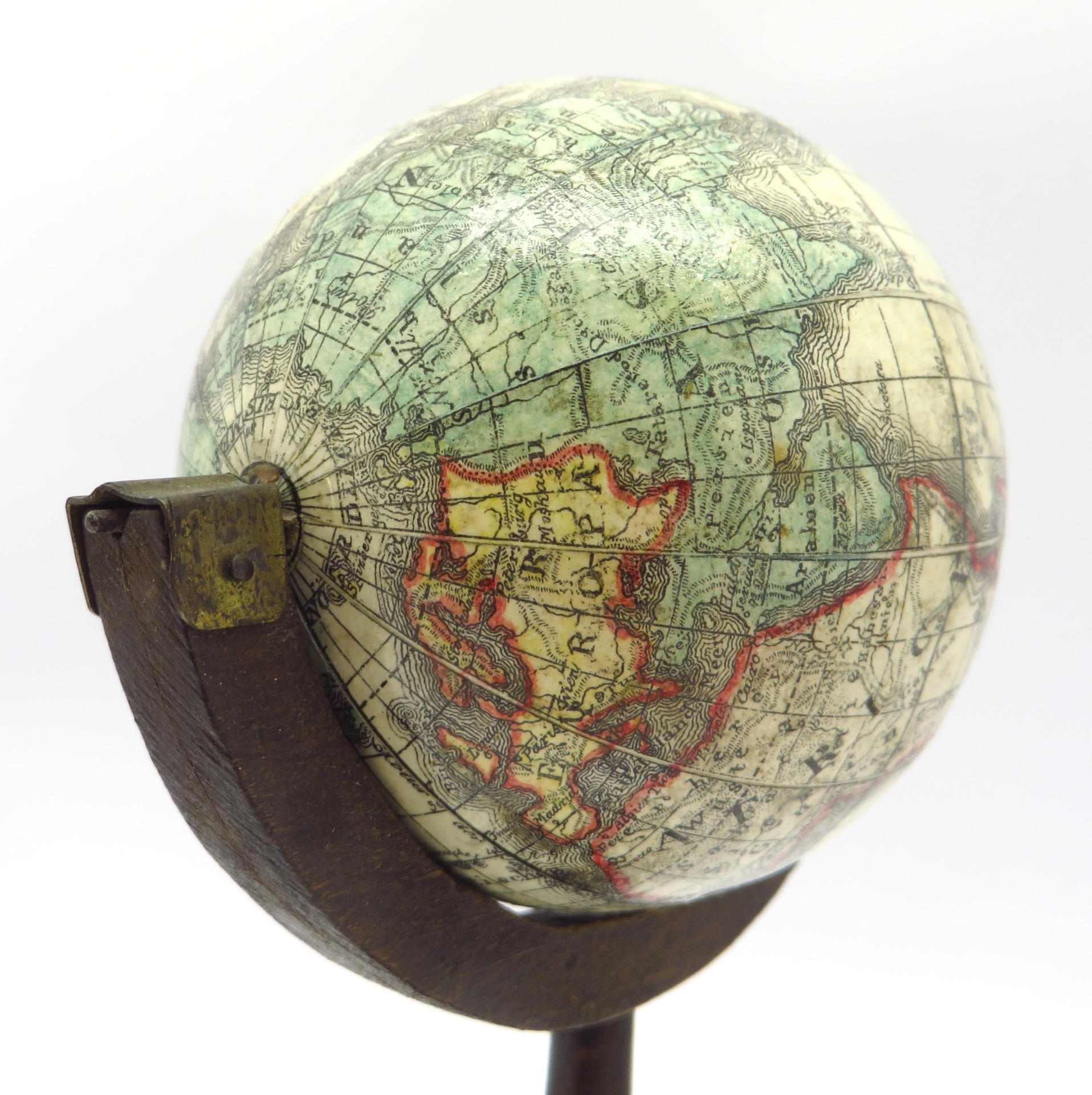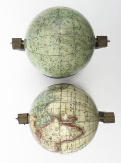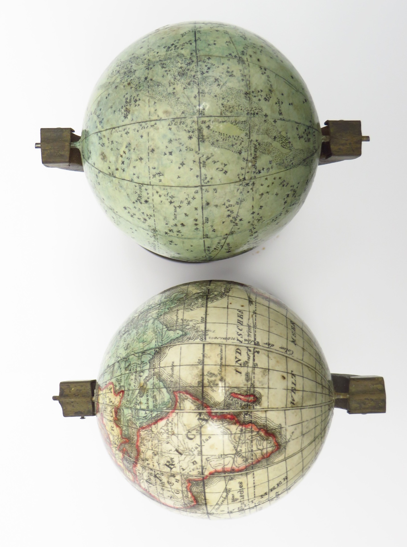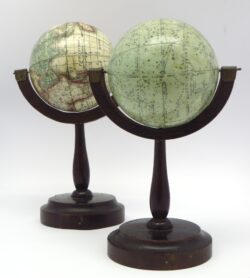 A rare pair of miniature terrestrial and celestial globes, each with 12 hand-coloured engraved paper gores, over a papier mâché and plaster sphere. Diameter globes: 7 cm. Total high: 14,5 cm. The globes have been cleaned and re-varnished, and the stands are later.