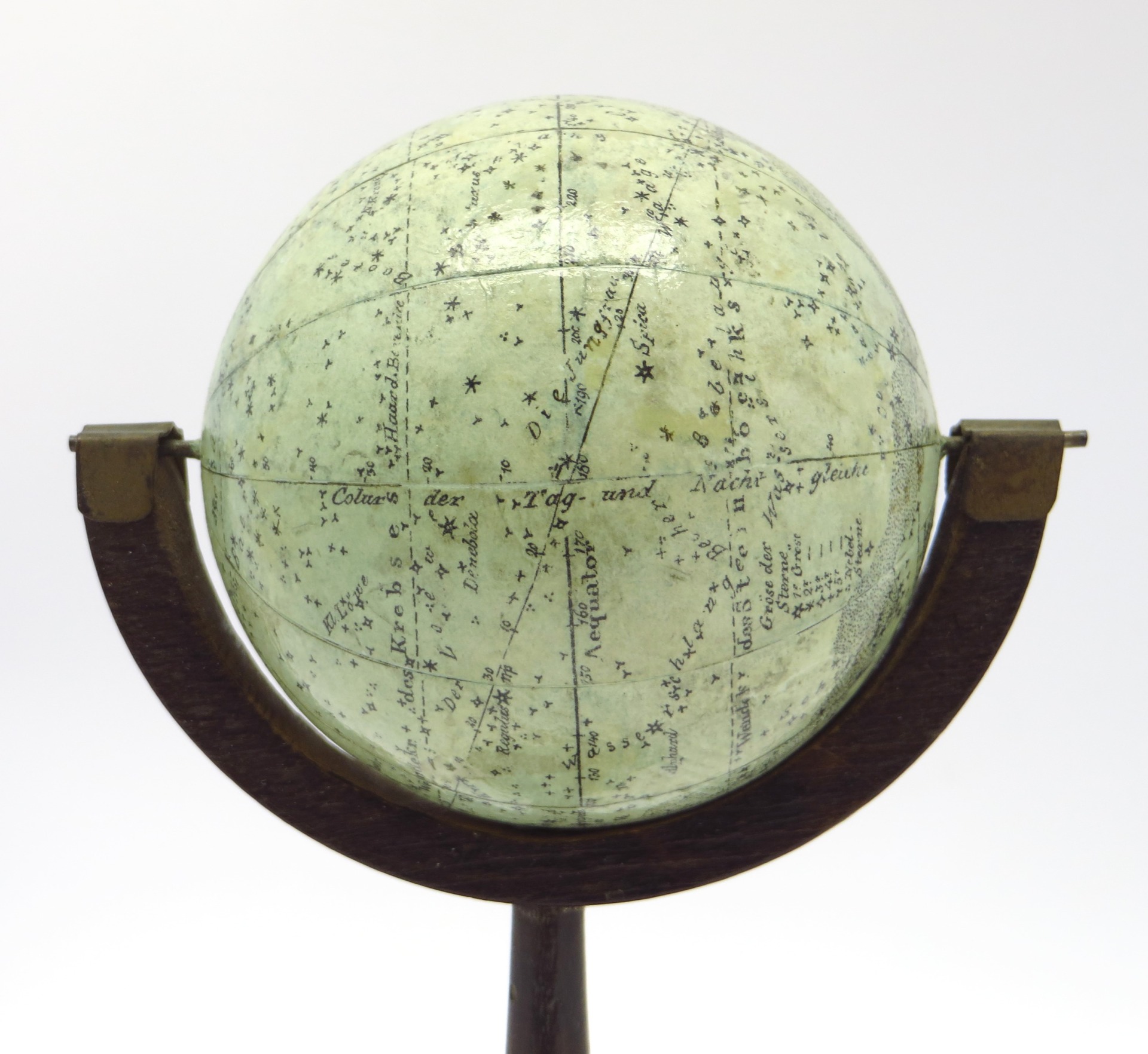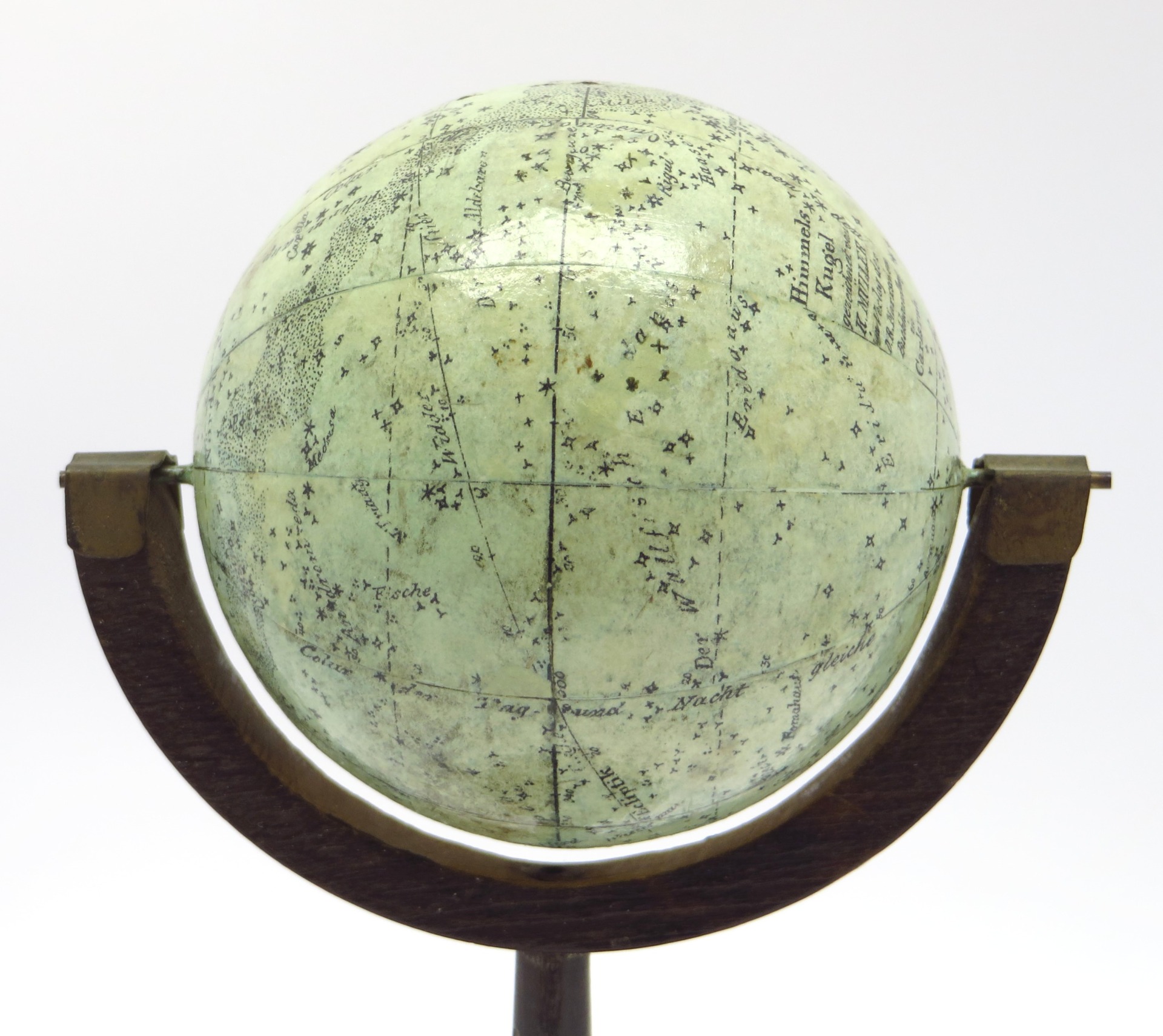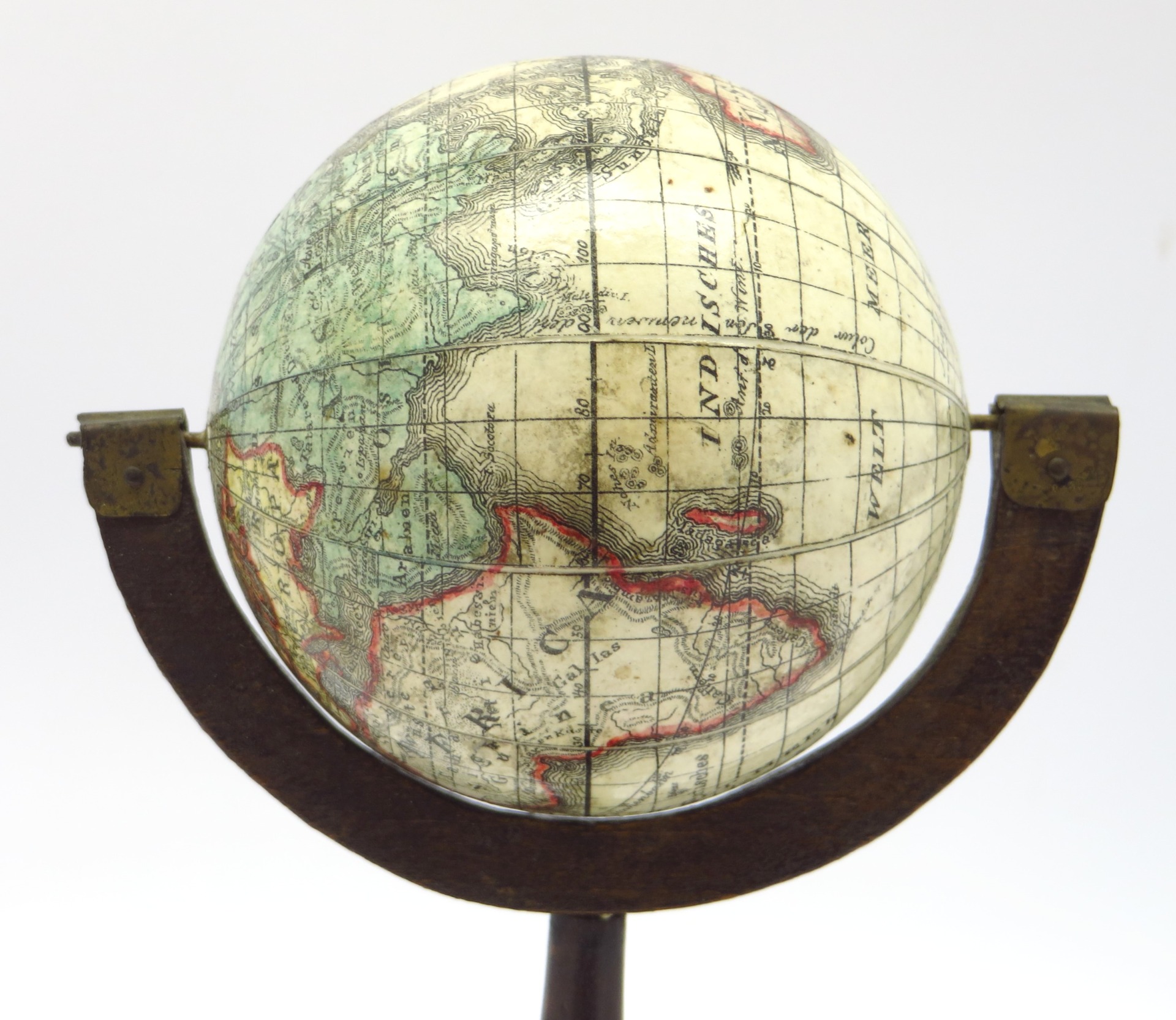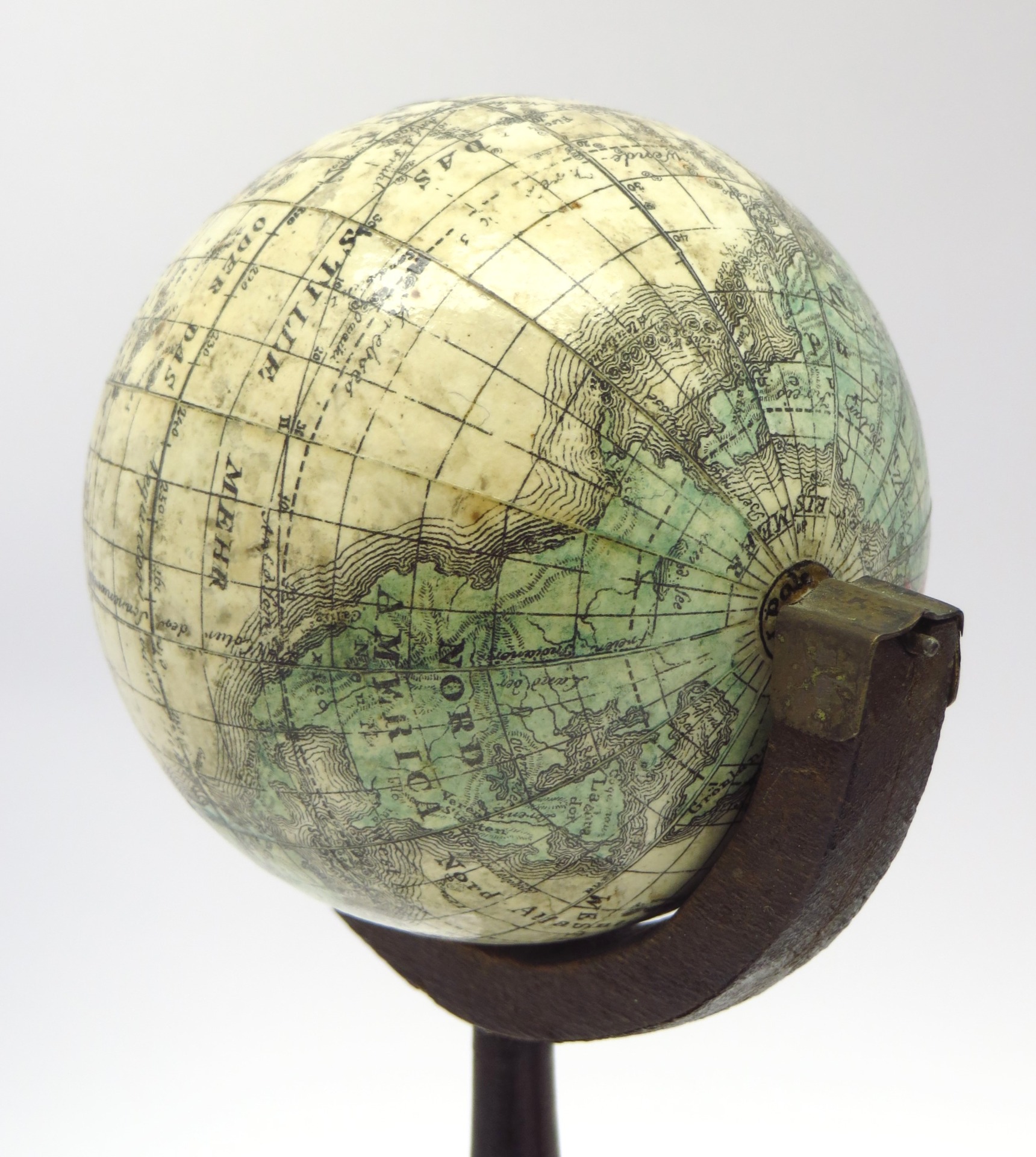 A rare pair of miniature terrestrial and celestial globes, each with 12 hand-coloured engraved paper gores, over a papier mâché and plaster sphere. Diameter globes: 7 cm. Total high: 14,5 cm. The globes have been cleaned and re-varnished, and the stands are later.