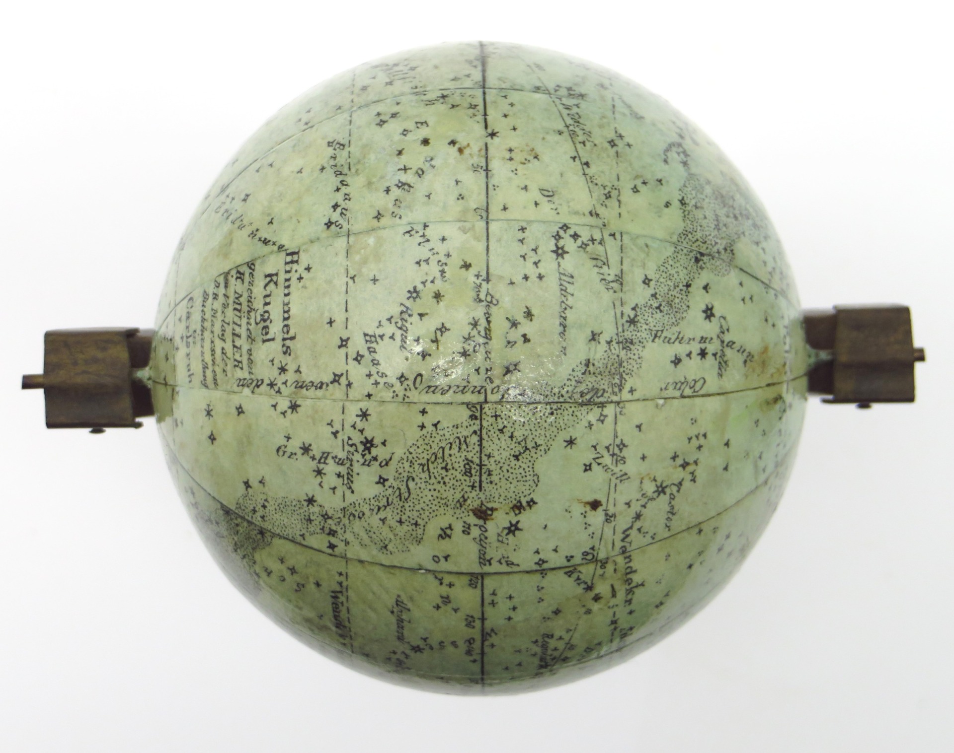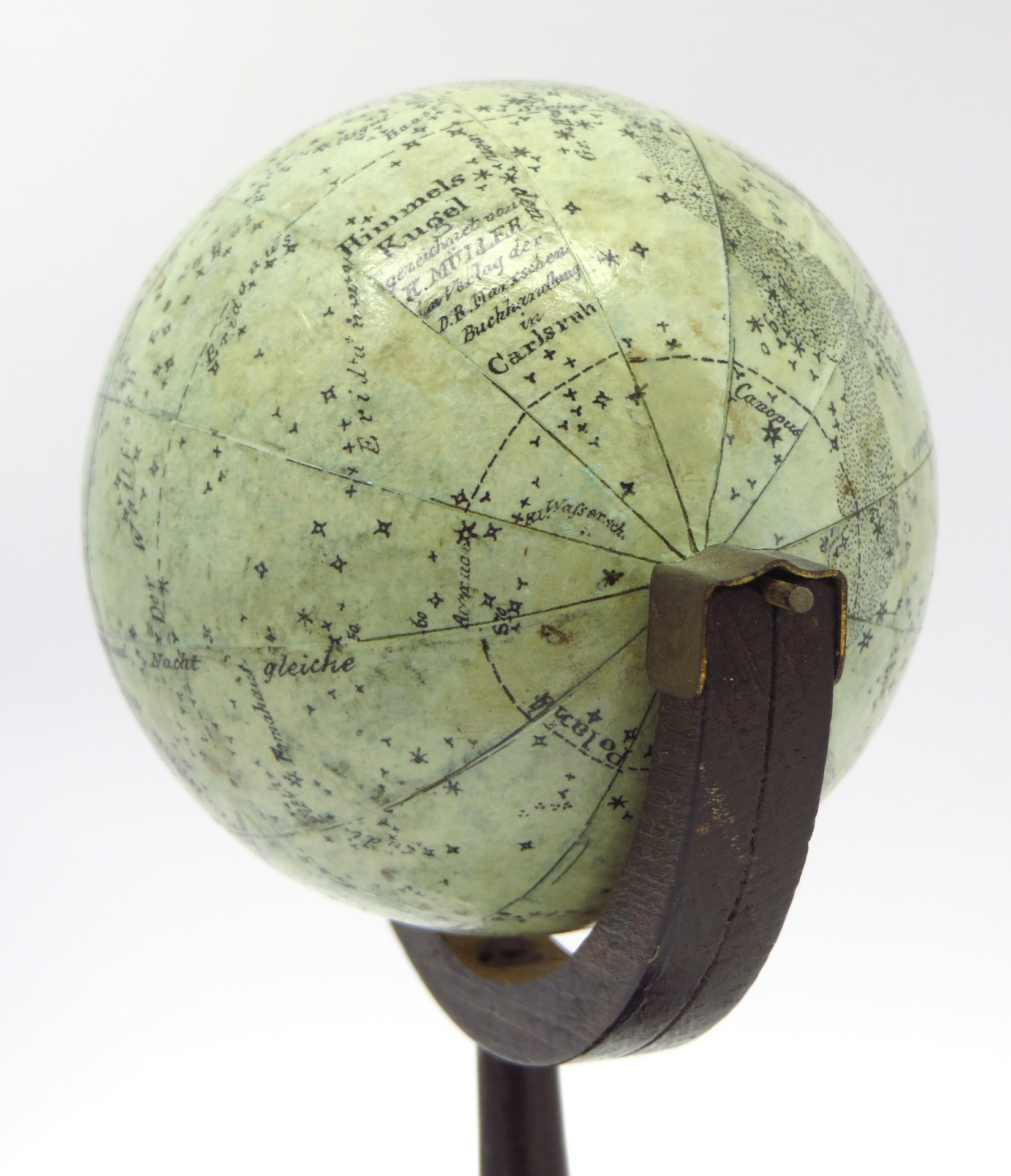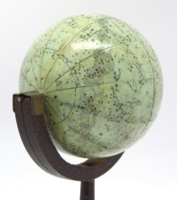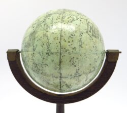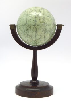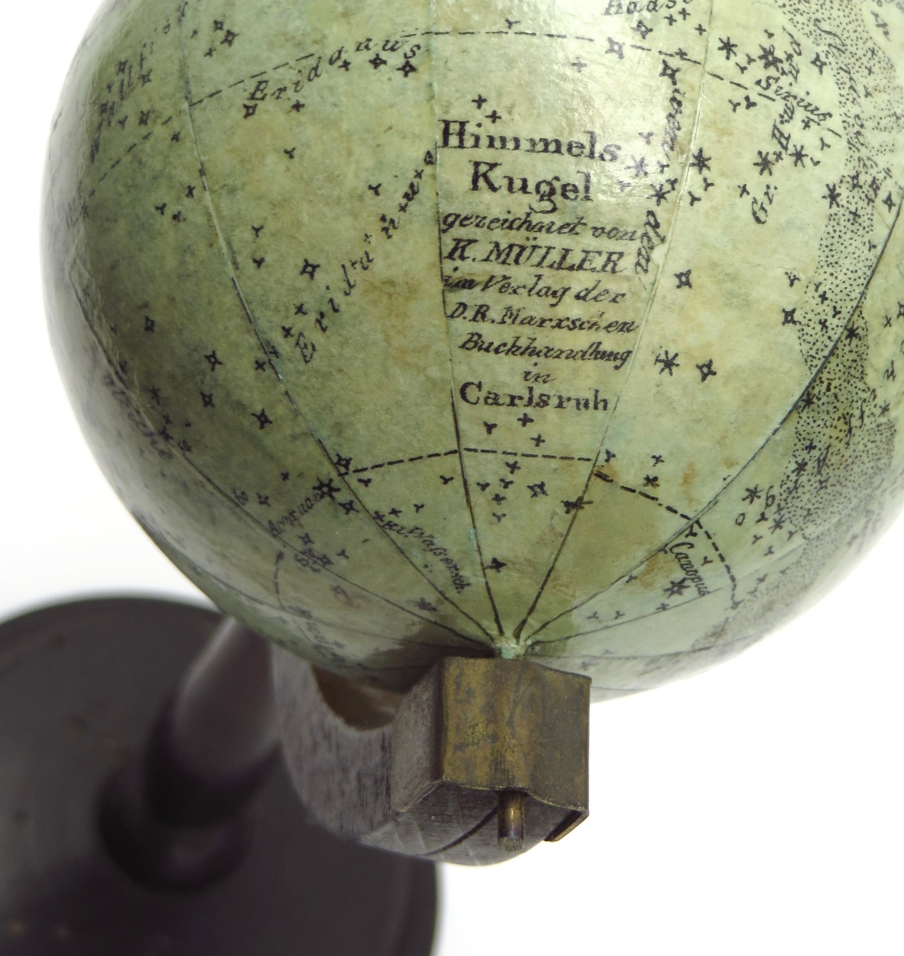 A rare pair of miniature terrestrial and celestial globes, each with 12 hand-coloured engraved paper gores, over a papier mâché and plaster sphere. Diameter globes: 7 cm. Total high: 14,5 cm. The globes have been cleaned and re-varnished, and the stands are later.