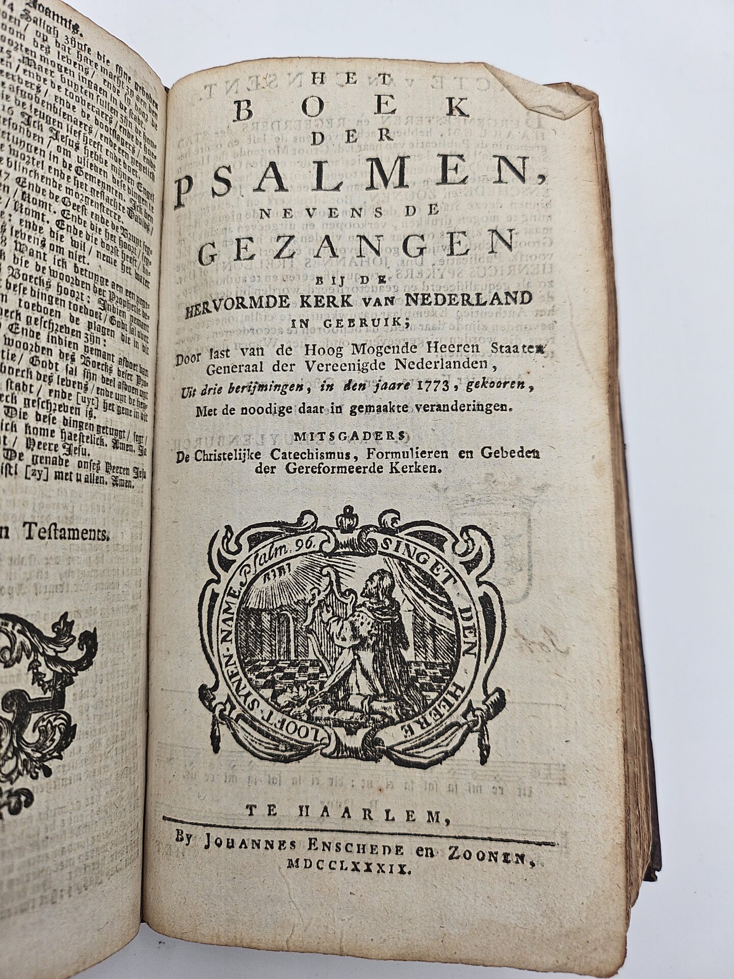 Biblia dat is de Gantsche H. Schrifture vervattende alle de Canonyke Boeken des Ouden en des Nieuwen Testaments, uyt de Oorspronkelyke Talen in onze Nederlandsche Tale getrouwelyk overgezet door Last van de Hoog Mog. Heeren Staten Generaal der Vereenigde Nederl. en Volgens het Besluyt van de Sinode Nationaal gehouden tot Dordrecht in de Jaaren 1618 ende 1619. Door gemeene ordre der Kerken van Drukfouten verbetert. WAARBIJ: Het Boek der Psalmen, nevens de Gezangen bij de Hervormde Kerk van Nederland in gebruik. Door last van de Hoog Mogende Heeren Staaten Generaal der Vereenigde Nederlanden, Uit drie berijmingen, in den jaare 1773, gekooren, Met de noodige daar in gemaakte veranderingen. Mitsgaders De Christelijke Catechismus, Formulieren en Gebeden der Gereformeerde Kerken.