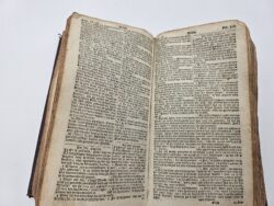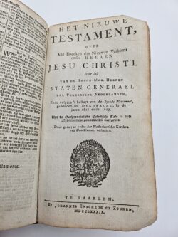 (gegraveerde titelpagina) 420, 132, 168 folia. Origineel Leer met ribben, goud-bestempeld en goud op snede, 12° 15,5 x 8,5 x 7 cm. Nederlandse Bijbel in de Statenvertaling, bestaande uit het Oude en Nieuwe Testament, de Psalmen en Gezangen en de Formulieren.