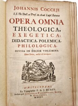 A landmark of Reformed theology and Dutch Golden Age printing. Johannes Coccejus (August 9, 1603 – November 4, 1669), a Dutch theologian, was born at Bremen. After studying at Hamburg and the University of Franeker, where Sixtinus Amama was one of his teachers, he became in 1630 professor of biblical philology at the Gymnasium illustre in his native town. In 1636, he was transferred to Franeker, where he held the chair of Hebrew, and from 1643, the chair of theology as well. Until 1650, he succeeded the elder Friedrich Spanheim as professor of theology at the University of Leiden. His chief services as an oriental scholar were in the department of Hebrew philology and exegesis. As one of the leading exponents of the covenant or federal theology, he spiritualized the Hebrew scriptures to such an extent that it was said that Coccejus found Christ everywhere in the Old Testament and Hugo Grotius found him nowhere. He taught that before as much as after the fall of man, the relation between God and man was a covenant. The first covenant was a Covenant of Works. For this was substituted, after the Fall, the Covenant of Grace, necessitating the coming of Jesus for its fulfillment. He held millenarian views and was the founder of a school of theologians known as the Cocceians. His most distinguished pupil was Campeius Vitringa.
