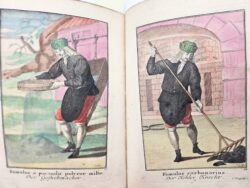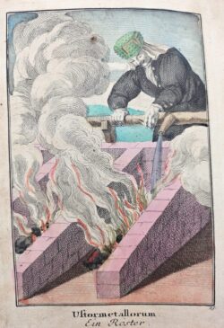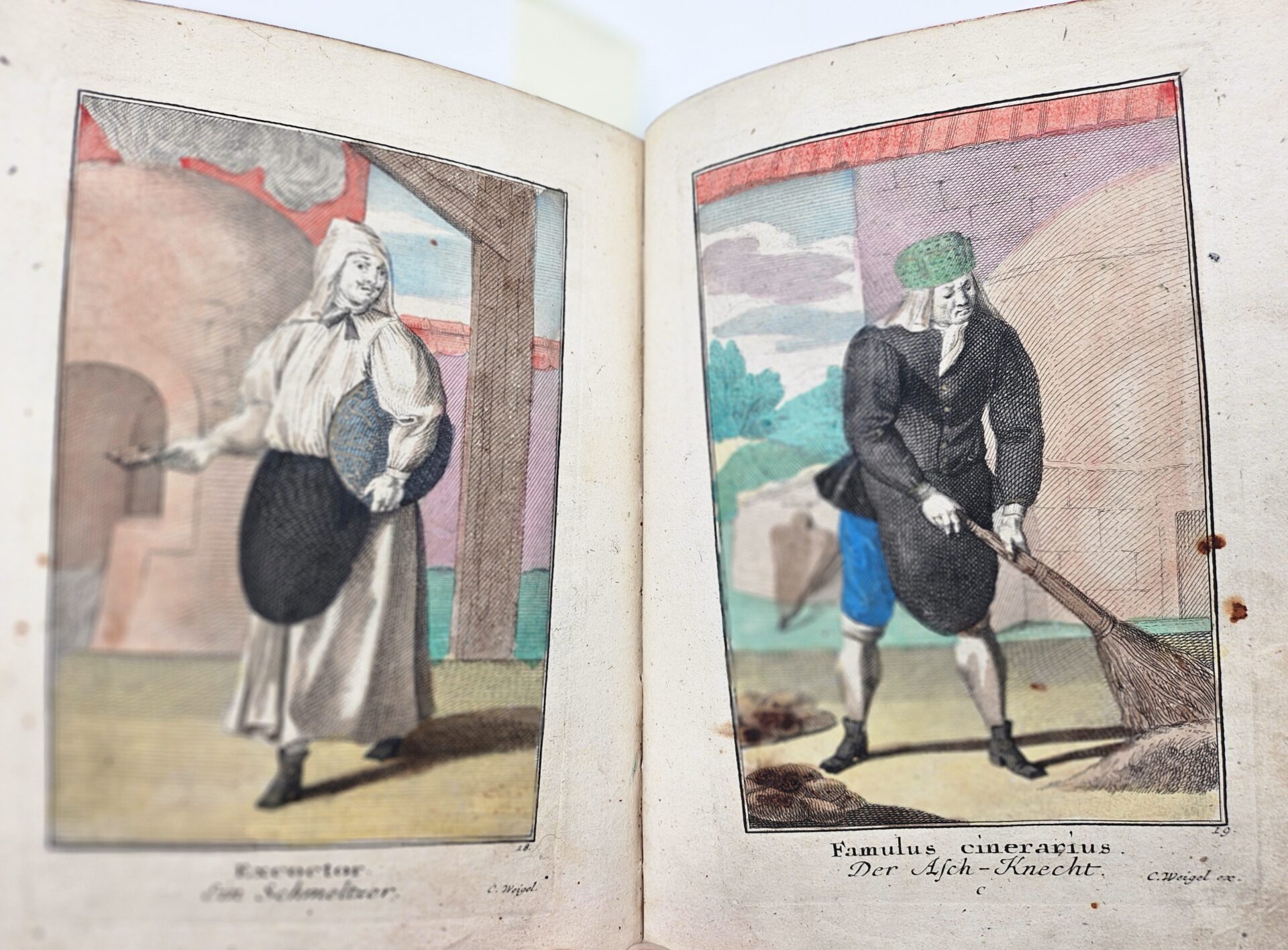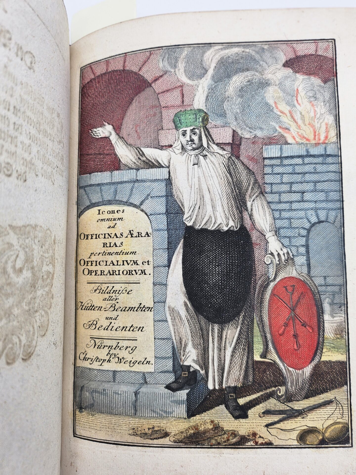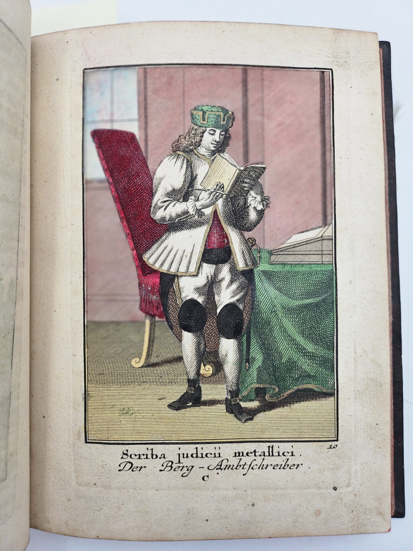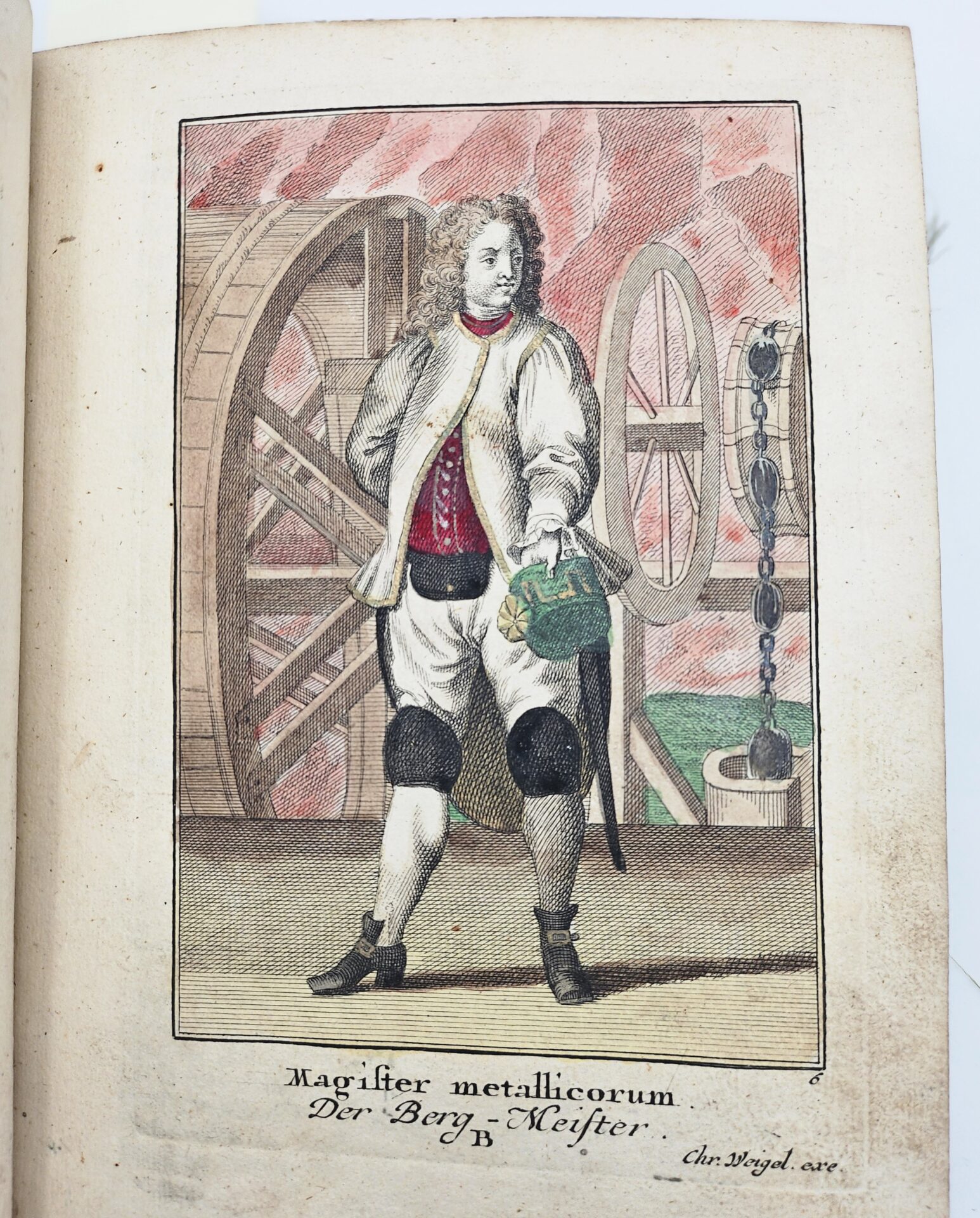 2 works in one volume, quarto (197 x 150mm). Titles printed in red and black, additional engraved titles, and 48 engraved plates, 24 in each work numbered 2-25, all coloured by a contemporary hand, of mining occupations, activities, and costumes, most signed by C. Weigel. The 4-leaf preface that was published as part of the second work is erroneously bound at the beginning of the first work, with occasional spotting, some light browning, and soiling. Contemporary sprinkled calf, remains of green silk ties, red sprinkled edges.